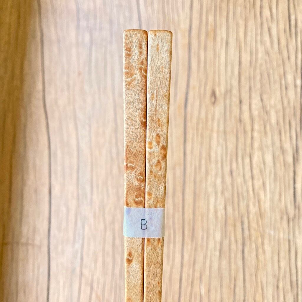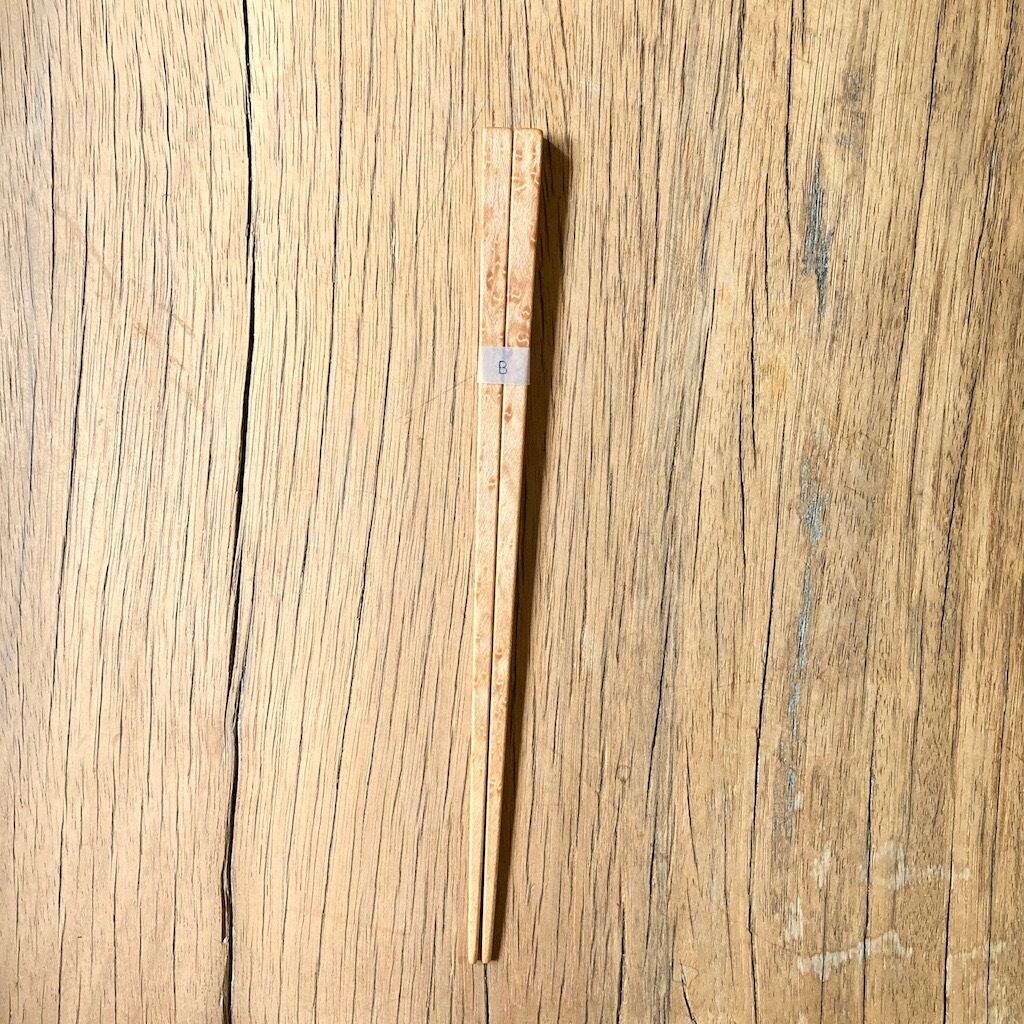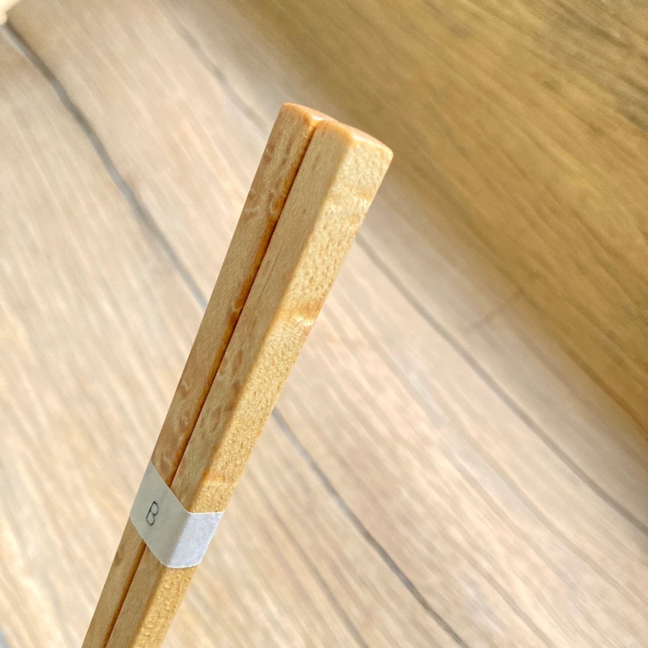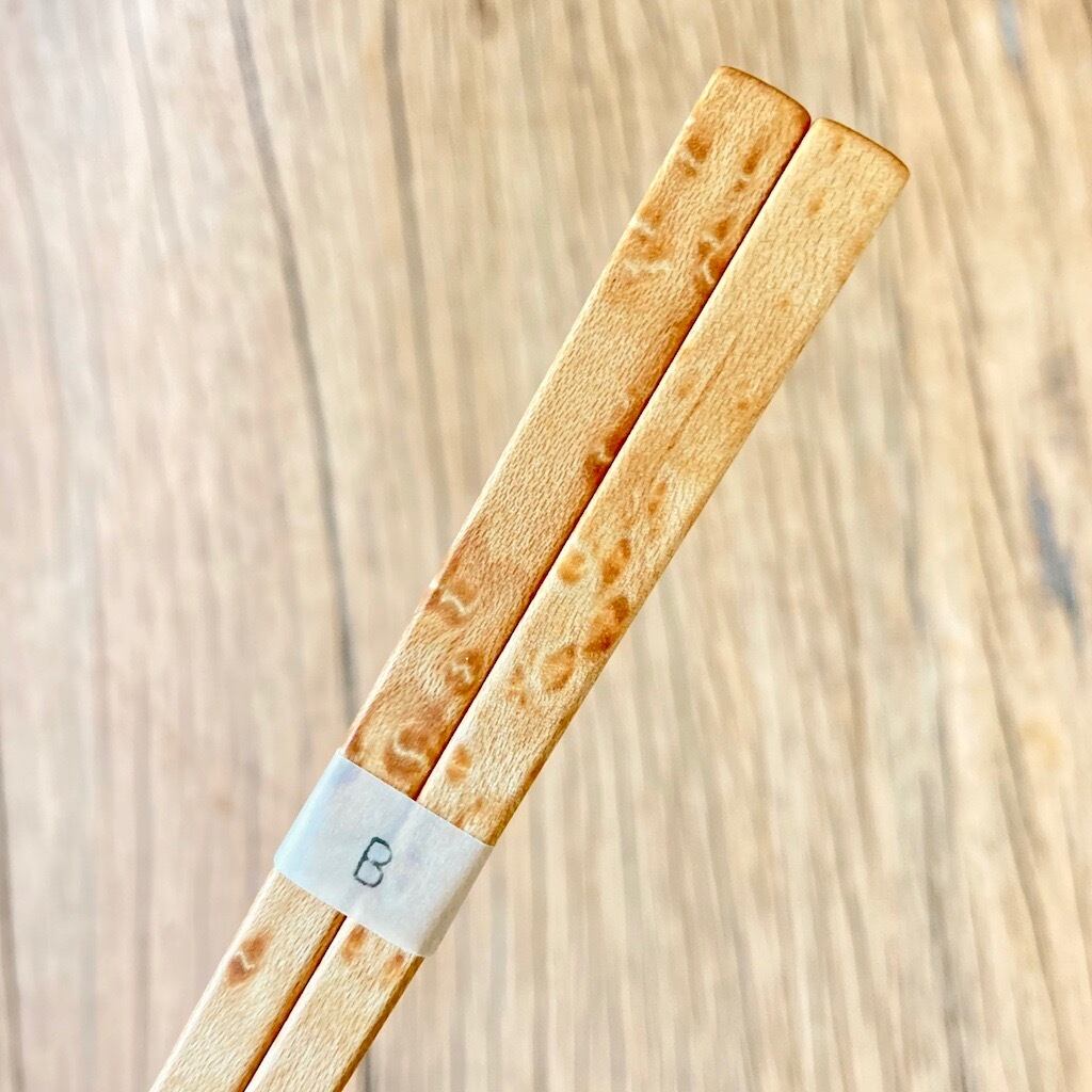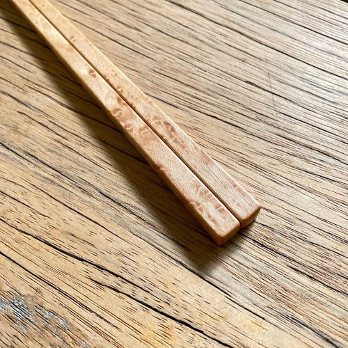 小鳥の目のような、美しい玉の木目が印象的なメイプルの木です。サラサラとした心地の良い、ややマットな手触りで、使い始めは少し毛羽立つように感じるかもしれません。木のお箸は、日々を重ねるごとに落ち着いてきて、優しく手に馴染んでゆきます。